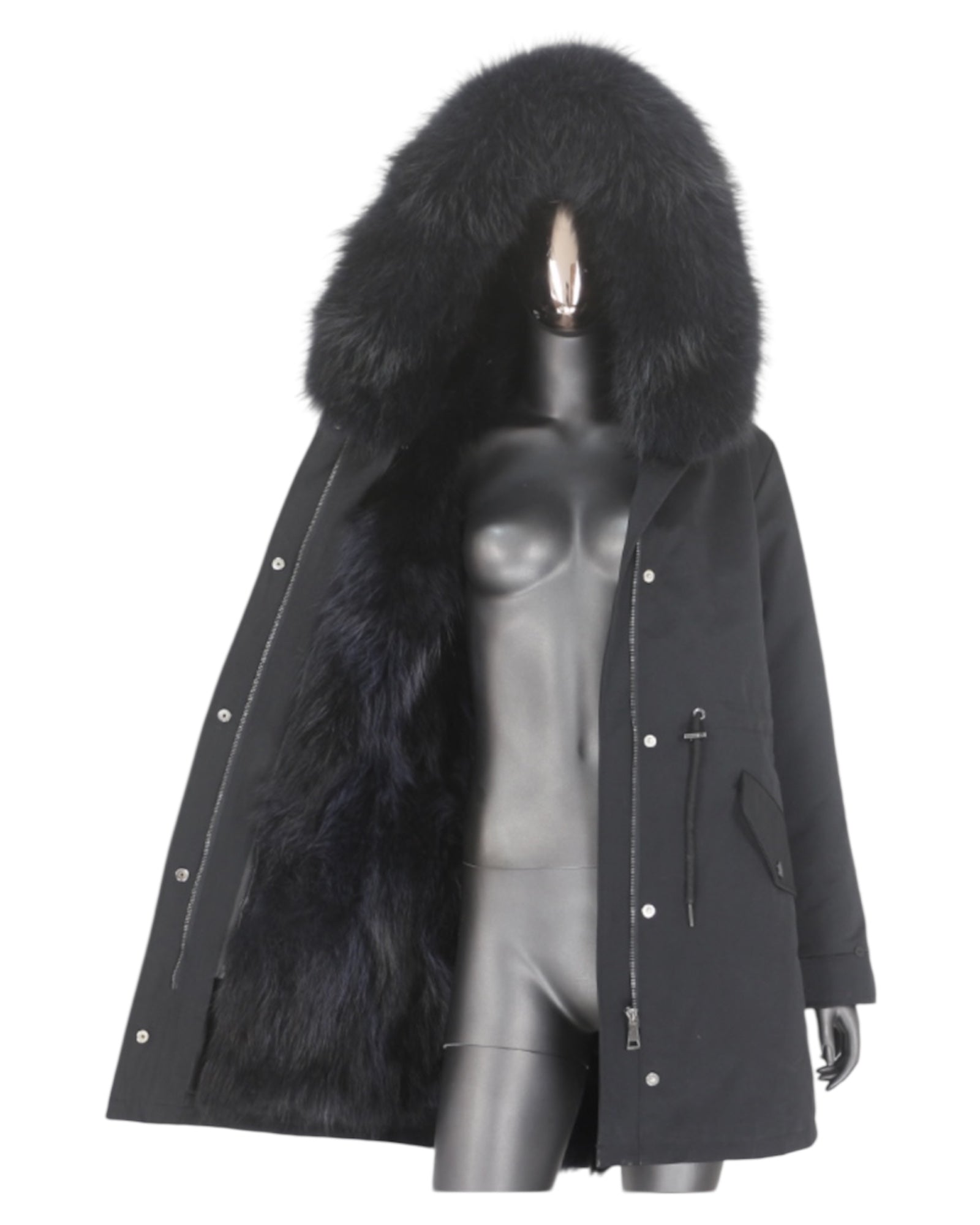 The absolute highlight is the removable lining made of genuine fox fur – luxurious, soft, and perfect for cold days. Thanks to the integrated waist drawstrings, the parka can be individually adjusted and accentuated with femininity.