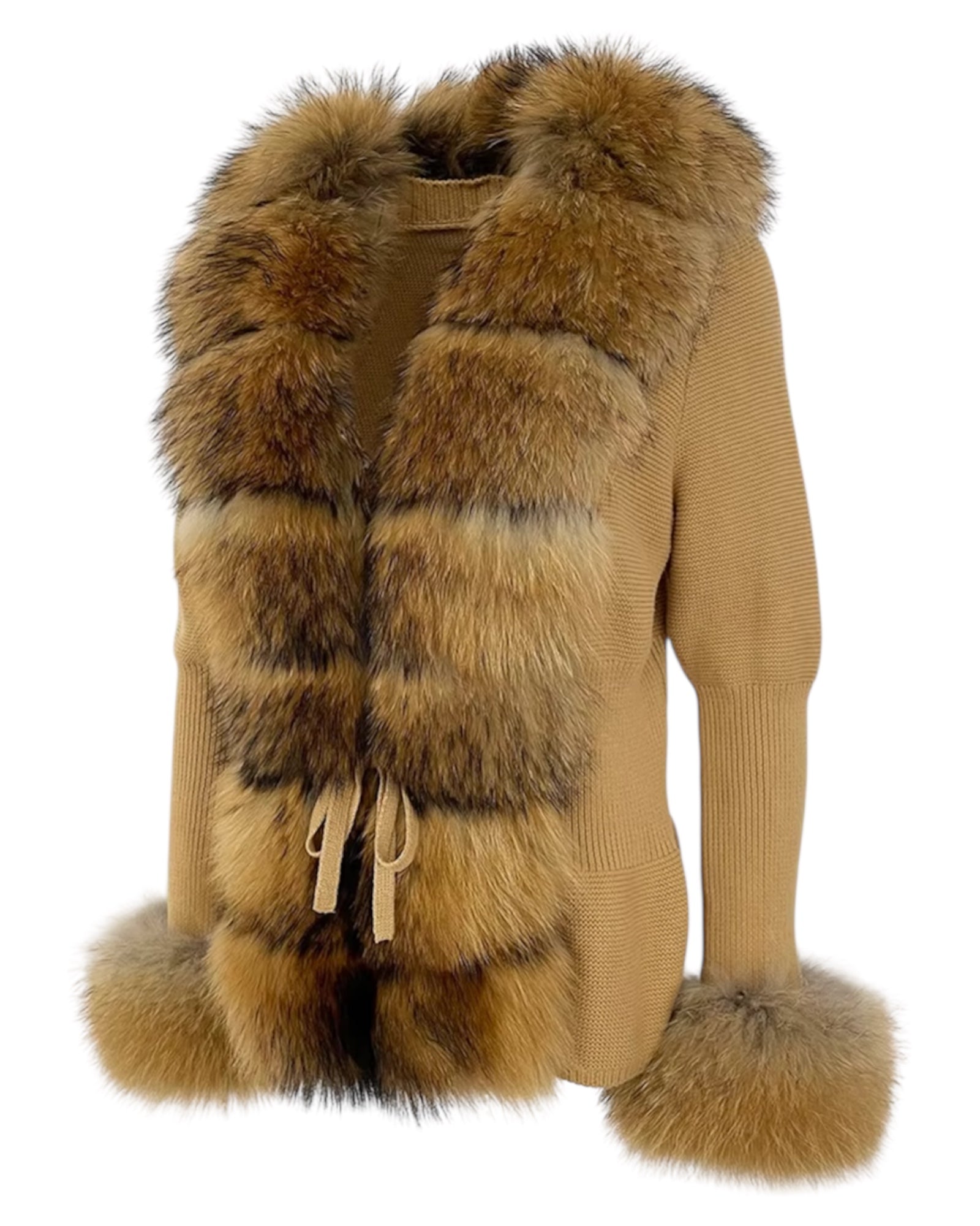 Le tissu en tricot doux assure un confort maximal, tandis que les détails en fourrure de haute qualité sur le col et les poignets ajoutent une touche de glamour.