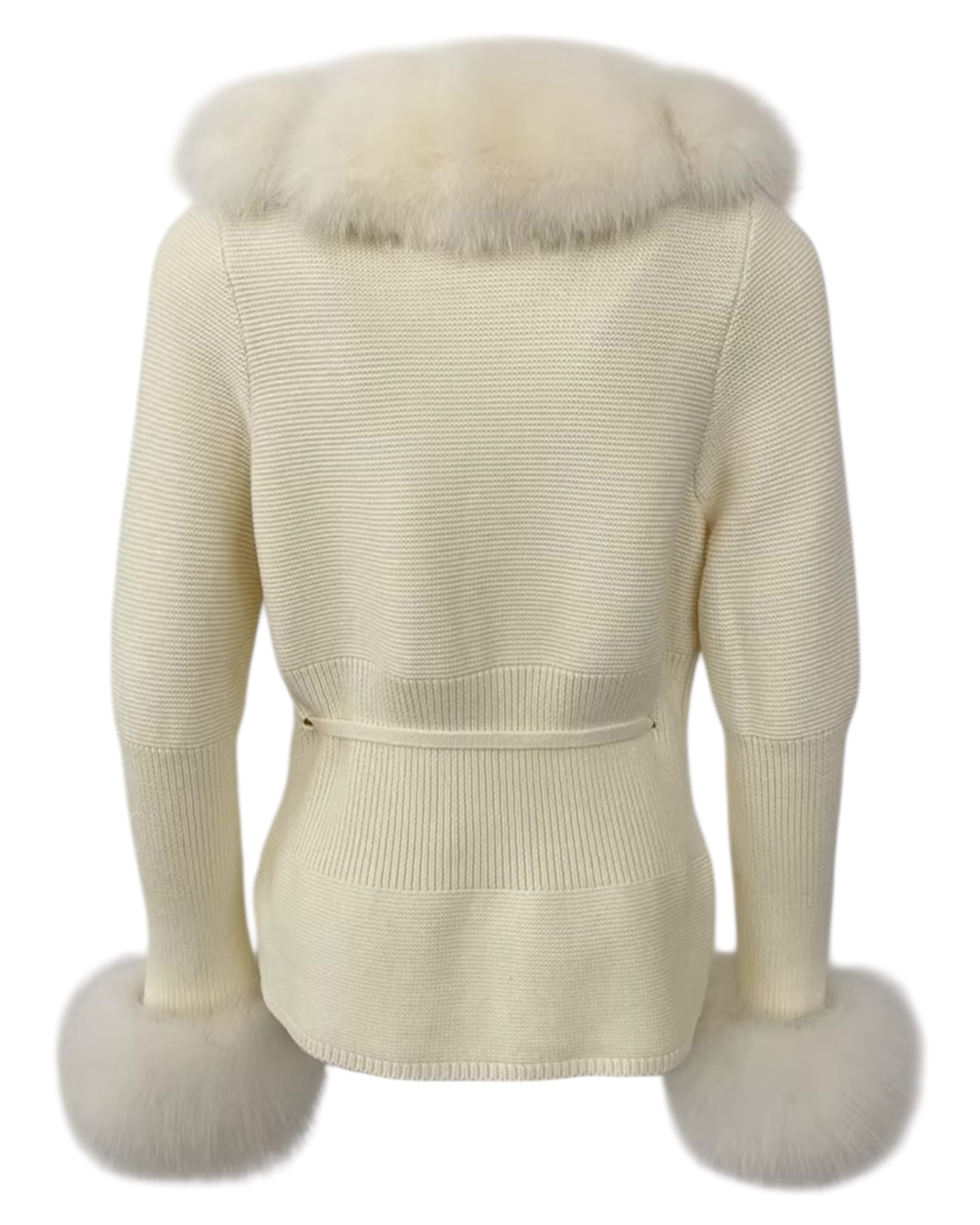 Le tissu en tricot doux assure un confort maximal, tandis que les détails en fourrure de haute qualité sur le col et les poignets ajoutent une touche de glamour.